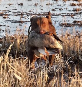 Kodi went to Jeremy Ries, Moco Bottoms Labs, when he was seven months old. He came back home for the 2025-26 duck season with his SHR (Started Hunting Retriever) title. Kodi had a successful duck season hunting with Mike in Arkansas and Kentucky. He also participated in a tower shoot where he was one of several dogs who retrieved pheasants for the shooters. Kodi will be returning to Jeremy once duck season is over and will be working for his JH (Junior Hunter) title and preparing for advanced contests.