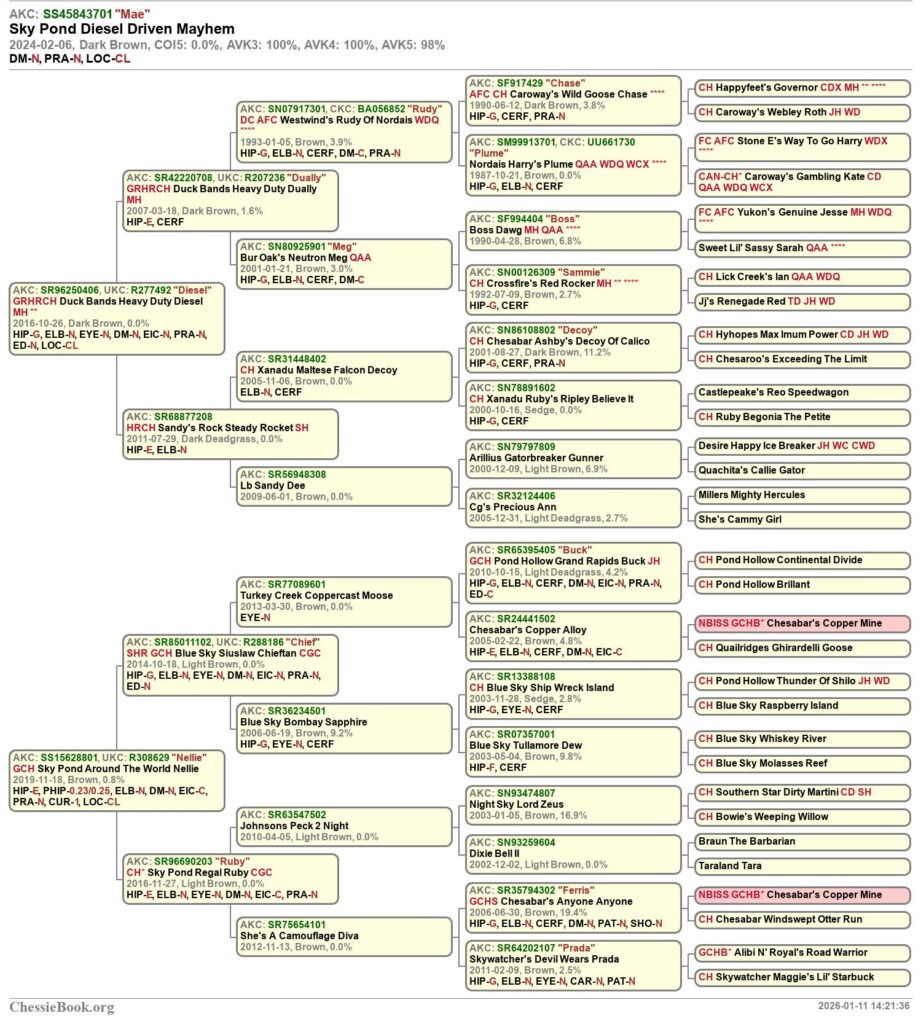 Recent records show there have only been twenty Chesapeake Bay Retrievers that have attained GRHRCH (Grand Hunting Retriever Champion). Mae’s sire, Diesel, is one of those twenty. His sire, Dually, is another of the twenty. So, two of the twenty GRHRCH titled dogs are in the first two generations of Mae’s pedigree. Nellie (Mae’s dam) has proven to be a producer of quality working dogs.