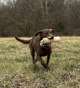 Mae is an energetic girl, quick to retrieve, learns fast and has a good dose of Chessie stubbornness. She’s a joy to be around and craves attention. She is being trained here at our kennel.